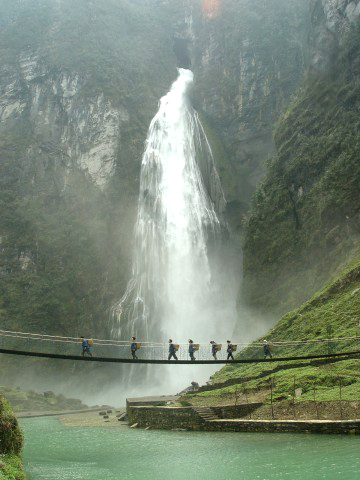瀑水從斧削狀絕壁上的溶洞奪口噴出,飛流直下,聲如霹靂,數里可聞,整個山谷煙云彌漫,霧氣蒙蒙,遠看瀑布如白練懸空,近看似銀河瀉天際。每當陽光照耀時,五光十色的浪花似彩虹凌空飛舞,艷麗奪目,蔚為壯觀。瀑高214m,建有一電站。