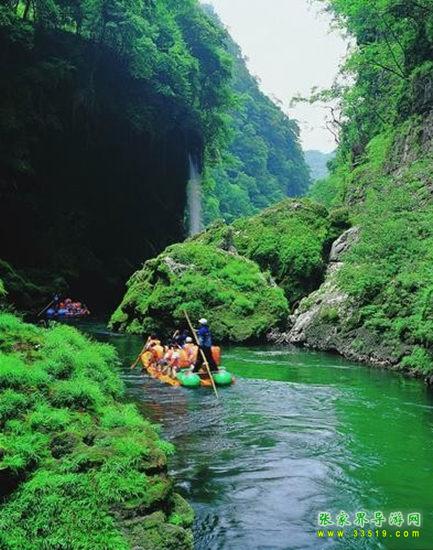 峽谷長100米,寬7米,高200多米。無數(shù)細(xì)流從絕壁上檐直垂河面,掛滿了峽谷,形成一條瀑布長廊。一縷縷、一絲絲、一串串宛若銀絲晶瑩透明。瀑布下面是一些奇形怪狀、滑得出奇的石頭露出水面,表面上青苔如茵,濕露露的、蓬松松的,像姑娘沒有織完的綠色地毯。谷中的漬石,塞在河心,酷似一頭牯牛,在河水的映襯下,輕緩移動(dòng),安然而富有生機(jī),游近瀑布,瀑聲如一群姑娘嬉笑逗鬧“咯咯”不停。遠(yuǎn)離瀑布,瀑聲又變得輕細(xì),似情人秘語沒完沒了,只不知牛郎織女躲到那里。如果說,落水坑瀑布?xì)鈩?shì)磅礴,不可阻擋,那么夢(mèng)思峽瀑布,情意綿綿,亦情亦景,若置身于夢(mèng)幻般的童畫世界,那無端的情思和無由的惦念一起涌來,使人飄然作相思?jí)簦悦麎?mèng)思峽。有人詩曰:夢(mèng)思峽水清悠悠,玉簾掛在天里頭,喬木昂首接青天,泛舟勝似畫中游。