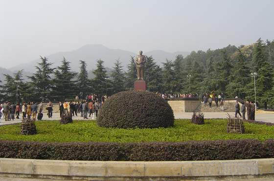 毛澤東銅像位于韶山沖的中心,紀念館、毛氏宗祠與韶山賓館之間。銅像區(qū)占地5200平方米,是經中共中央批準興建紀念毛澤東同志誕辰100周年的重點獻禮工程。這里原是一片沃野,地勢平坦開闊,周圍群山拱護。韶蜂在遠處,高峻挺拔,云富坨大山巍峨雄壯,十八羅漢山逶迤綿長,黑石寨鐵骨錚錚。在山的襯托下,銅像更顯得氣勢磅礴。