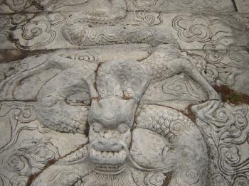 廟前面有學宮坪,亦名學坪,坪南端有大明壁。廟宇紅墻黃瓦,氣勢宏偉。正門曰奎星門,前院左右各植檜樹,常年翠綠,散發(fā)幽香??情T內(nèi)有月形泮池,池周護以石欄。泮池附近有石坊三座,正南石坊匾額鐫有“斯文在茲”四字,東西兩坊貫通街衢。通過石坊便是大成門。進門左右是飛檐綠瓦的鐘鼓亭。大成門通向大成殿,有石鋪甬道直抵大殿臺基。臺高一米,全系石塊疊成。臺階分左右兩道,中有石雕盤龍,綴以云海波濤,栩栩如生,躍然石上。大成殿為歇山式重檐結(jié)構(gòu),周圍有16根圓石柱,內(nèi)外枋、檁、藻井、斗拱、扇梧均五彩施繪,黃瓦飛檐,蔚為壯觀。殿后有亞圣殿,與大成門、奎星門前后襯應(yīng),更顯出大成殿主體的雄偉。