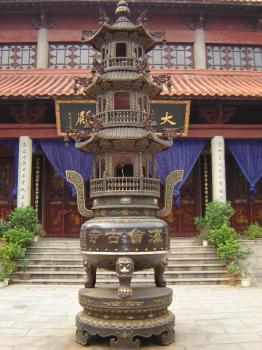 鹿苑早傳燈,信般若真如,華言妙諦,大千界恒河濁世,相期普證菩提,村化七家余,數(shù)桐葉為秋,幾歷罡風(fēng)消浩動;龍池今雨會,溯南湘佛地,無代禪宗,五百年滄海桑田,何幸一新蓮社,堂開三個后,看綠陰無恙,好憑香火結(jié)良緣。