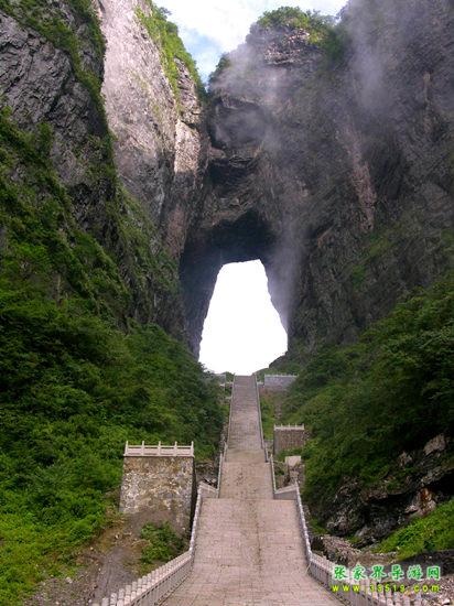天門洞位于天門山山體的中上部,是世界上最高海拔的天然穿山溶洞,海拔1300米 ,其高131.5米,寬57米 ,深60米。它南北對開于千尋素壁之上,扶搖而通天,似明鏡似天門鑲嵌于蔚蔚天幕之上,終年吞云吐霧,蔚為壯觀中更加神秘莫測。“天門洞開云氣通,江東峨眉皆下風(fēng)”元朝的著名詩人張兌曾這樣贊嘆,磅礴的氣勢由此可見。1700多年來,這一道奇絕天下的勝景吸引著無數(shù)的探訪者趨之若騖。特別是在1999年,世界特技飛行大師架機(jī)穿越天門洞,在全球引發(fā)了轟動效應(yīng),收看現(xiàn)場直播的觀眾達(dá)到8億之多。