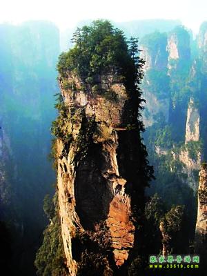 憑欄俯視,300余米高的峭壁猶如斧劈,草木叢生,幽洞玄奧,但聞水聲,不見溪谷。溪畔50米處一巨峰高達300余米,腰圍數(shù)十米,渾圓如柱,雄偉離奇。相傳共工與顓頊爭奪帝位失敗后怒觸不周山,折了天柱,飛來半截于此,故名乾坤柱。爾后許多神仙云游此地,留下不少古跡。此柱南有數(shù)條直達山頂?shù)木G色峽谷,似神仙往來的通道。右邊一峰柱,上不有如一只皮靴,稱神靴巖,相傳是曹國舅扔下的一只不合腳的靴子。觀景臺右側(cè)那株根部彎曲的古松名鐵拐松。