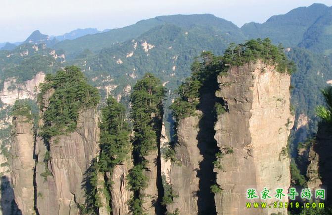 黃石寨西北崖沿下,6座高達(dá)200多米的橢圓形石柱,呈南北向一字排開在黃石寨與袁家界之間約2000米長的溝谷中。石柱大小和間距相當(dāng),柱頂皆為平臺,似一派待建橋面的橋墩。中間兩墩稍高,兩邊漸次降低。各柱頂可連成一條弧線,氣勢恢宏。橋墩下河床干涸,怪石嶙峋,樹木依稀,顯得古野、蒼涼。雨天,云霧滿壑,似一江怒濤,橋墩時隱時現(xiàn)。若逢東邊日出西邊雨時,便有絢麗壯闊的彩虹南北飛架,與橋墩形成雙美合壁的奇觀。