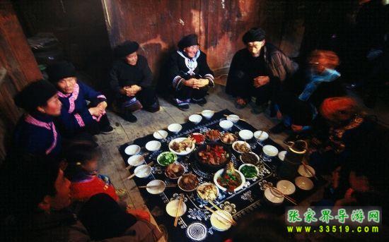土家人趕年時,先把菜全部上桌后,再盛一碗飯,加一些葷菜,飯碗上放一雙筷子,那時土家人先祭拜他們的祖先,然后家人上桌開始趕年。土家人年餐菜都必須是自家養(yǎng)的和自家產(chǎn)的,自家養(yǎng)的如豬、牛、羊、魚等,自家產(chǎn)的如紅薯粉、黃豆、青菜等等。