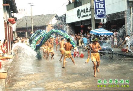 張家界潑水龍又叫“澆水龍”,于唐朝時期由移居本地的白族興起演變而成,在永定區(qū)的尹家溪鎮(zhèn)西尹村、莫家崗村十分盛行,是當(dāng)?shù)?a class="insidelink" href="http://m.daogoumao.com/fengqing/" title="土家族">土家族,白族、苗族在天熱干旱時節(jié)求雨祈福的一種形式。一旦出現(xiàn)旱災(zāi),當(dāng)?shù)仡^面人物就會出來組織潑水龍,演出極其隆重。
