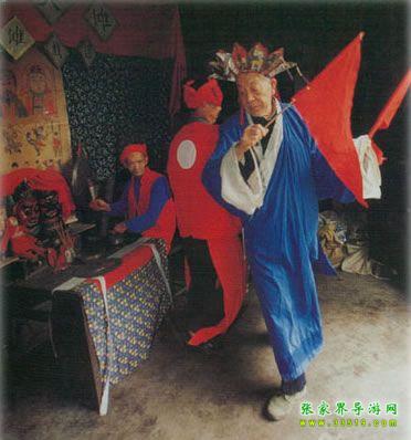 儺戲在湘西土家族地區(qū)也稱儺堂戲、儺神戲,它與土家族原始巫教、巫術(shù)的關(guān)系極為密切。土家族先民信奉的神有儺神、八部大神、土地神等,作為一種宗教活動,這種原始信仰與社會生產(chǎn)活動、文娛活動及民族習(xí)俗是融為一體的,因此儺戲最先的“沖儺還原”帶有明顯迷信色彩,土家族群眾中有“一儺沖百鬼,一愿了千神”的說法,湘西土家族人干脆叫它為“神戲”。湘西土家族儺戲的發(fā)展過程大體是儺、儺舞、儺儀然后才產(chǎn)生儺戲。儺舞源于久遠(yuǎn)的蒙昧?xí)r期,土家先民們在同大自然作斗爭、同毒蟲猛獸作斗爭,便產(chǎn)生了化裝護(hù)面、在鼓樂聲中奔騰呼號、沖殺跳躍的原始儺舞,其所模擬的鳥雀舞、猿猴舞、熊舞等頗為壯觀。儺舞與儺這種驅(qū)鬼消災(zāi)的祭祀儀式結(jié)合后,增加了祈求人獸平安、五谷豐登、緬懷祖先、勸人去惡從善、以及傳播生產(chǎn)知識等內(nèi)容,這就逐漸形成了兼?zhèn)潢U弘教義及娛樂性質(zhì)的祭祀風(fēng)俗歌舞。[2]土家族儺戲就是在此基礎(chǔ)上發(fā)展起來的。部分土家族學(xué)者認(rèn)為土家族儺戲的遠(yuǎn)源可以追溯到戰(zhàn)國時代的《九歌》,《九歌》是土家族儺戲的雛形,他們的依據(jù)是當(dāng)時楚國的沅湘流域,人們“信巫鬼、重淫祀”(《漢書·地理志》),從而使得“陰陽人鬼之間,又或不能無褻慢淫荒之雜”(宋代朱熹《楚辭集注》)。屈原正是加工整理了這一類“鄙陋”之詞,才創(chuàng)作出《九歌》、《天問》等名篇。也有部分學(xué)者不贊同這種論點,他們認(rèn)為土家族儺在宋代還停留在儺祭和儺舞階段,最遲到明代,土家族儺才發(fā)展成為儺戲[3]。嘉靖《常德府志》記載:“歲除,歲將盡數(shù)日,鄉(xiāng)村多用巫師,朱裳鬼面,鑼鼓喧舞竟夜,名曰還儺。”文中未點明“儺戲”二字,但卻使用了“還儺”一詞,這與今天民間對儺戲的稱呼相似。又據(jù)清乾隆《永順縣志》載:“永俗酬神,必延辰郡巫師唱演儺戲,……至晚,演儺戲。敲鑼擊鼓,人各紙面一,有女裝者,曰孟姜女;男扮者,曰范七郎。”在土家族儺戲中,孟姜女傳說故事占著非常重要的地位。在湘西土家族地區(qū),儺戲一般有二十四正戲,即二十四戲神。每次儺儀結(jié)束時,巫師要用香火在黃裱紙上燒二十四個洞,以表示奠祭二十四戲神。民間有諺語:“儺神菩薩不識字,只要二十四個圈圈滿。”在二十四儺神中,被稱為勾愿神的姜女、范郎是還儺愿時非常重要的兩位神靈。在儺戲中,《孟姜女》是整場的高潮,平時,儺戲唱完后,由沒下裝的孟姜女、范郎去向主人家及觀眾“拜臺”,以示“了愿”。清代中期以后,儺戲吸取了花燈、陽戲、高腔等其他地方戲劇劇種的唱腔和劇目,逐漸變得日益成熟。我們仔細(xì)查看了全國371個劇種,發(fā)現(xiàn)儺戲、花燈戲有著相同的班社,也就是說一個演出班社可以演出儺戲、花燈戲兩個劇種。這段時期,儺戲已作為獨(dú)立戲劇劇種參加演出。由于儺戲是由巫儺法事演變而成的戲劇形式,經(jīng)歷著巫儺法事(驅(qū)鬼祭祀)、儺壇上戲和儺堂正戲的發(fā)展過程。