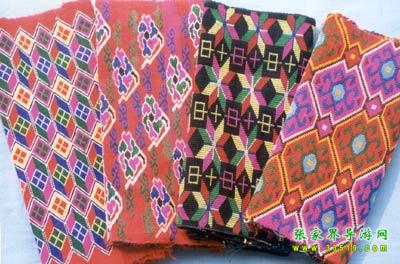 刺繡。是土家姑娘在直紋平布上,按照布紋的經(jīng)緯和預(yù)先繪畫的花樣與底色不同的絲線繡成圖案。舊時(shí)姑娘們穿的繡花衣服,繡有服飾花邊、胸花、帽花,此外繡花枕頭、繡花荷包等也是精巧的手工工藝品。土家刺繡在配色上有自己的講究與習(xí)慣,一般選用青、藍(lán)、大紅等深色布料作底布,用淺色繡線制作圖案,或者相反,兩種用法的結(jié)果使繡品顯得質(zhì)樸逼真,色澤鮮艷,對(duì)比強(qiáng)烈。傳統(tǒng)圖案有“花開富貴”、“龍鳳呈祥”、“鴛鴦戲水”、“喜鵲鬧梅”、“松鶴同壽”等,分室內(nèi)、衣著、工具、行李裝飾等多種種類。在景區(qū),土家婦女邊繡邊賣的精美鞋墊,深受海內(nèi)外游客喜愛。