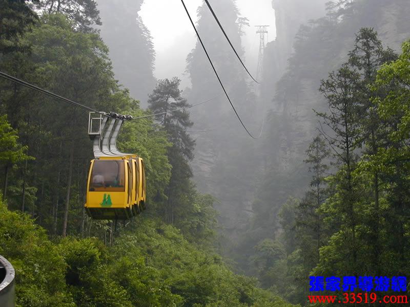 (索道站)現(xiàn)在,我們就要乘索道下山了。黃石寨(黃獅寨)索道是1995年5月至1997年9月臺(tái)灣證吉興業(yè)有限公司與張家界公園管理處合資興建的我市第一條觀光索道。索道線路水平距863,高差431米,運(yùn)行速度每秒8米,單向小時(shí)運(yùn)量948人,設(shè)備全部從法國(guó)波馬公司引進(jìn),總投資4000多萬(wàn)人民幣。黃石寨(黃獅寨)索道的建成,為公園開辟了一條空中游覽線,填補(bǔ)了張家界無觀光索道的空白。古詩(shī)說:會(huì)當(dāng)凌絕頂,一覽眾山小。乘索道觀張家界公園,別是一番感受。