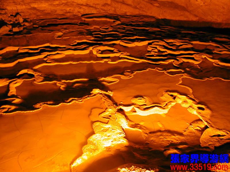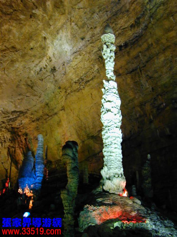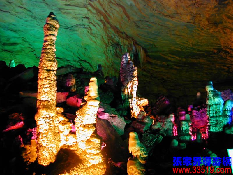 (龍宮)龍宮是黃龍洞十三個大廳中最大的一個,也是景色最美的景點之一,底面積15000平方米,平均高40米,兩千余根石筍拔地而起,千姿百態(tài),異彩紛呈,或如飛禽走獸,或如宮廷珍藏,有的像巍巍雪松,有的像火箭升空。龍宮后園有金銀兩座花池,清水常溢,花簇盛開。宮頂鐘乳柳垂簾掛,四周壁畫栩栩如生。溶解著各色各樣的礦物質(zhì)的水,從巖層中滲透出來,滴落下來。礦物質(zhì)在洞頂凝固結(jié)晶成倒懸鐘乳石,從鐘乳石滴落的水又把礦物質(zhì)澆疊、堆壘在洞底,而長成節(jié)節(jié)向上的石筍。大家看看這龍宮的造型,領(lǐng)略這磅礴的氣勢。洞內(nèi)最大石筍,高12米、直徑10米的漢白玉天然石椅“龍王寶座”居高臨下,眾多石柱石筍似人似物,維妙維肖,圍著寶座朝拜山呼,幾十座珊瑚亭亭玉立,儼然一支龐大的“宮廷樂隊”。湖南著名教授羊春秋先生作《寄生草》詞對此進(jìn)行描繪:“百態(tài)千姿模樣,三宮六院門巷。龍王開宴設(shè)瓊漿,猴王偷果鬧天堂,君王納寵擁羅帳。搬演了人間爭攘,匯集了天下奇觀。”
