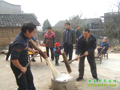 土家人民素有“二十八,打粑粑”的說(shuō)法。每逢春節(jié)來(lái)臨,農(nóng)歷臘月末,家家都要打糯米糍粑,所謂打糯米糍粑,據(jù)當(dāng)?shù)剜l(xiāng)土志書(shū)記載:“系糯米飯就石槽中杵如泥,壓成團(tuán)形,形如滿月。大者直徑約尺5,尋常者約4寸許,3至8分厚不等。”打糯米糍粑是一項(xiàng)勞動(dòng)強(qiáng)度較大的體力活,一般都是后生男子漢打,兩個(gè)人對(duì)站,先揉后打,即使冰雪天也要出一身汗。做粑粑也很講究,手粘蜂臘或茶油,先出砣,后用手或木板壓,要做得玉圓光滑,講究美觀。