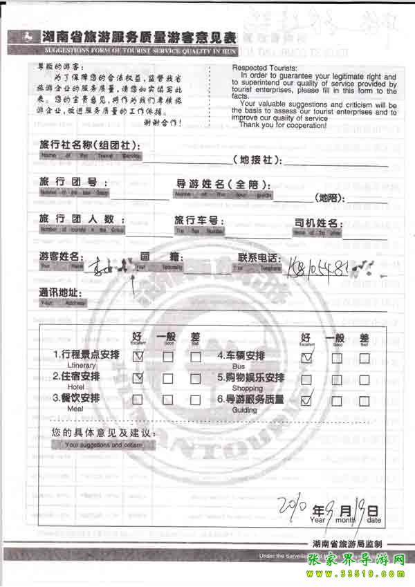 2010年9月19日李小姐旅游質(zhì)量反饋