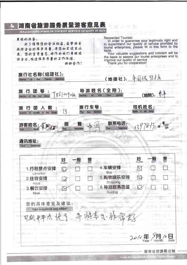 2010年9月10日廣西黃先生一行13位旅游質(zhì)量反饋:導(dǎo)游表現(xiàn)非常好